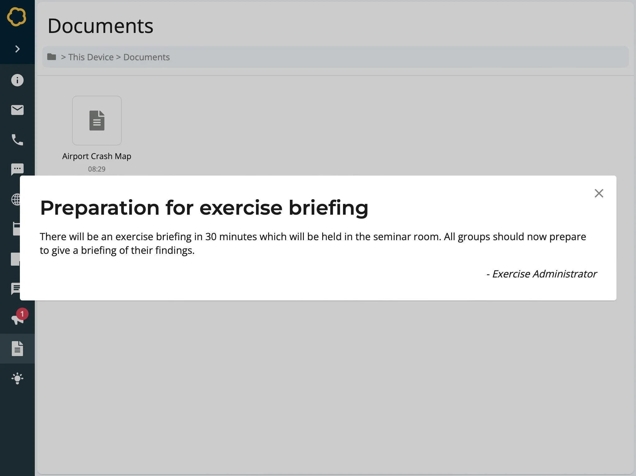 It is often necessary to communicate administrative messages to participants during an exercise. This inject allows you to schedule announcements to groups or individuals at any time in the exercise.